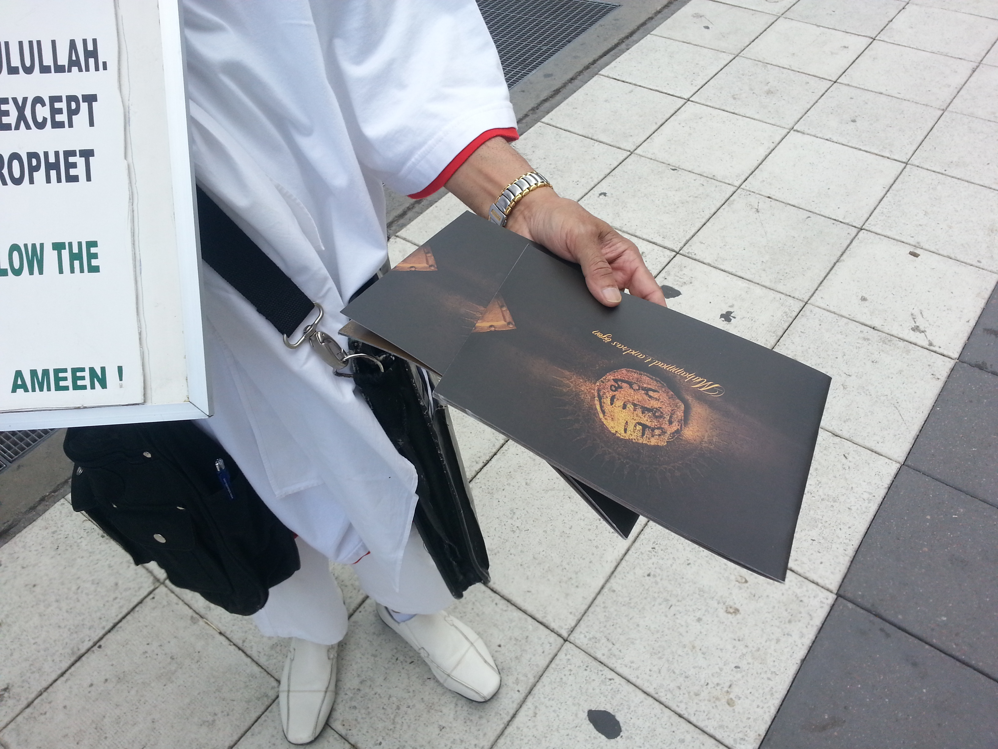 4. خنده دارترین قسمت این تبلیغات نوشتن شهادتین به انگلیسی و درخواست از عابران برای از رو خواندن آن می‌باشد که در نهایت تشرف فرد مربوطه به دین اسلام ثبت میشود ، در آخر سال هرکدام از این بنگاه‌های فروش دین آمار تازه مسلمان هارا به دولت مرکزی اعلام می‌کند و بعد هم مطبوعات از آن آمار به عنوان رشد چند صد درصدی اسلام در اروپا و آمریکا یاد میکنند